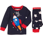 Experience the magic of the night with these 'Blast Off' pyjamas, featuring a majestic rocket standing out against a dark background. The red collar and cuffs provide a bold contrast, and the bottoms are adorned with a charming starry print. Complete with a 'Minoti' elasticated waistband and matching cuffs.