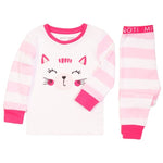 Magical pyjamas in pink and white, adorned with a charming cat on a bright white backdrop. The sleeves and collar feature bold stripes in bright pink, while the bottoms boast the same pattern as the sleeves and are adorned with a comfy 'Minoti' elasticated waistband and matching cuffs.