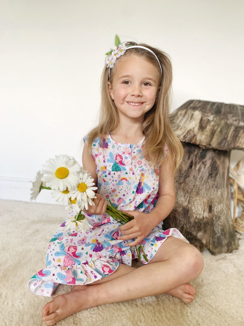 Transform bedtime into something special with our fairy nightdress. This sleeveless cotton nightie showcases a whimsical fairy print adorned with a pretty frilled hem and charming pink flower buttons, ideal for warm summer nights. The soft, breathable fabric moves freely, promoting comfort and restful sleep.