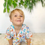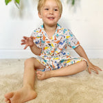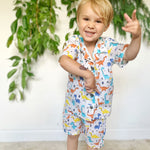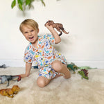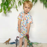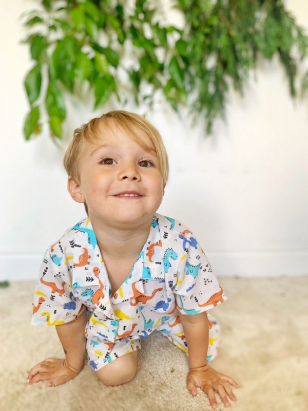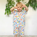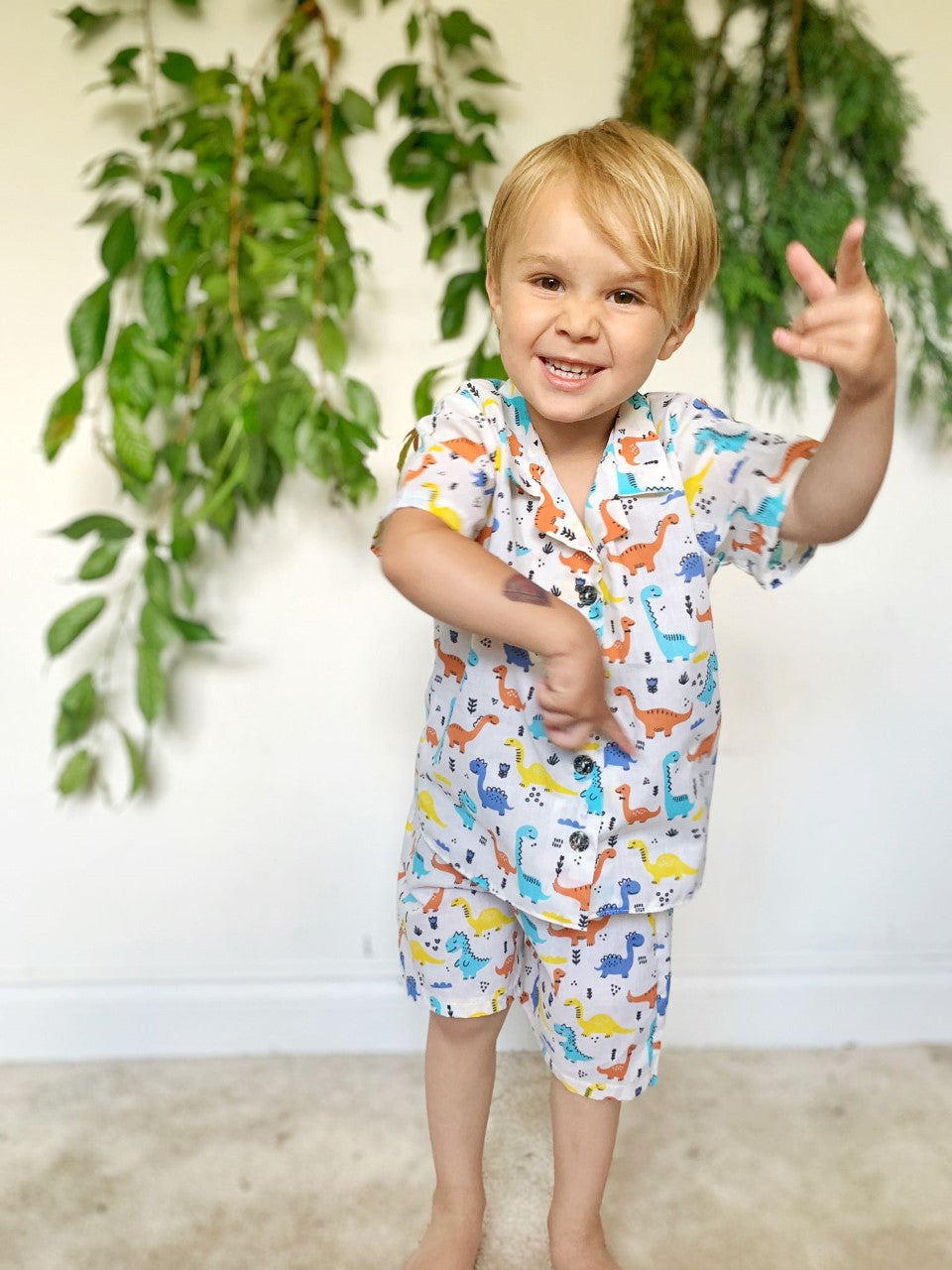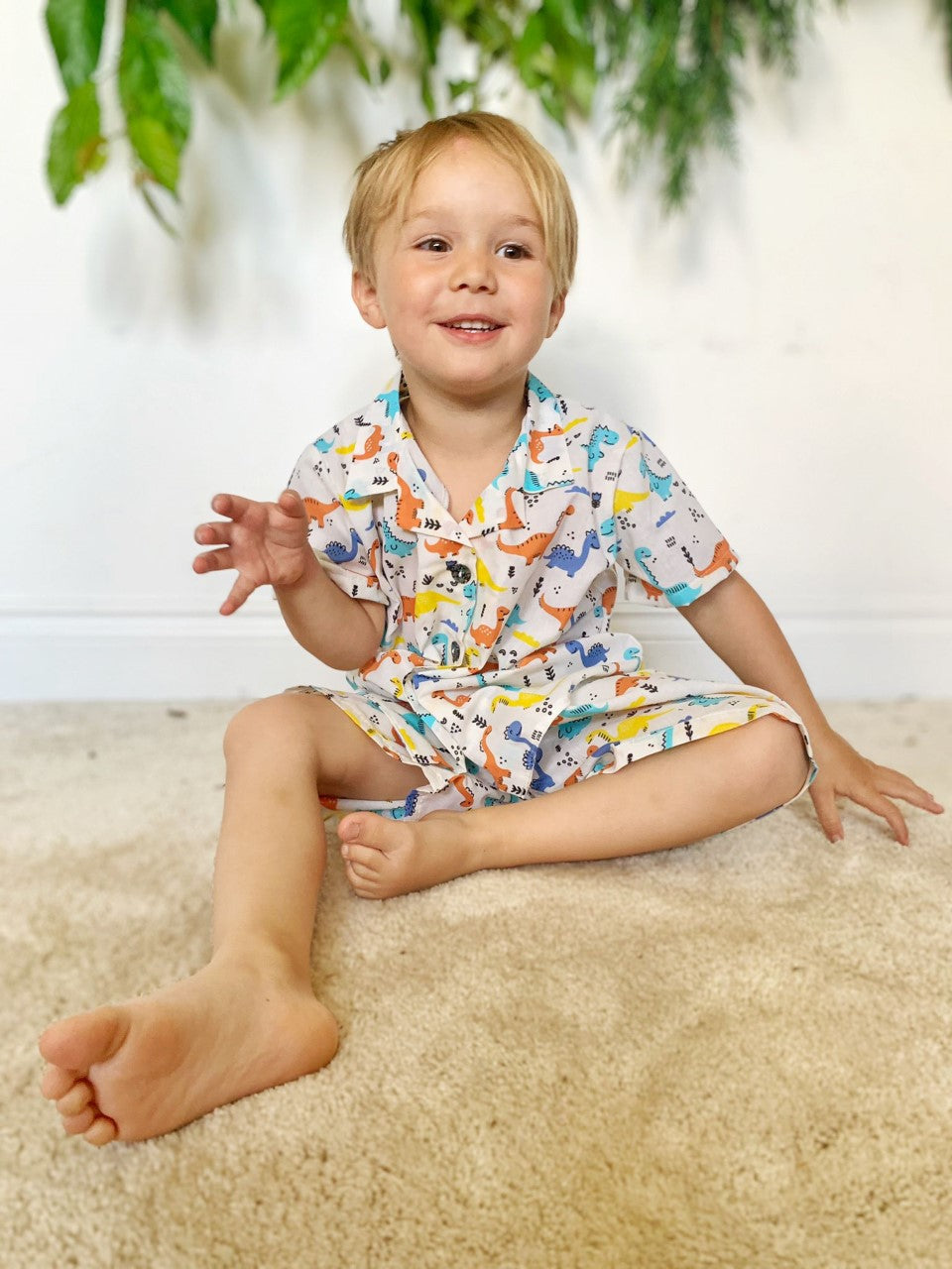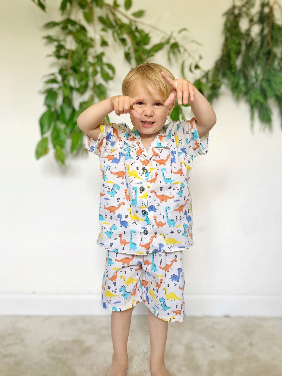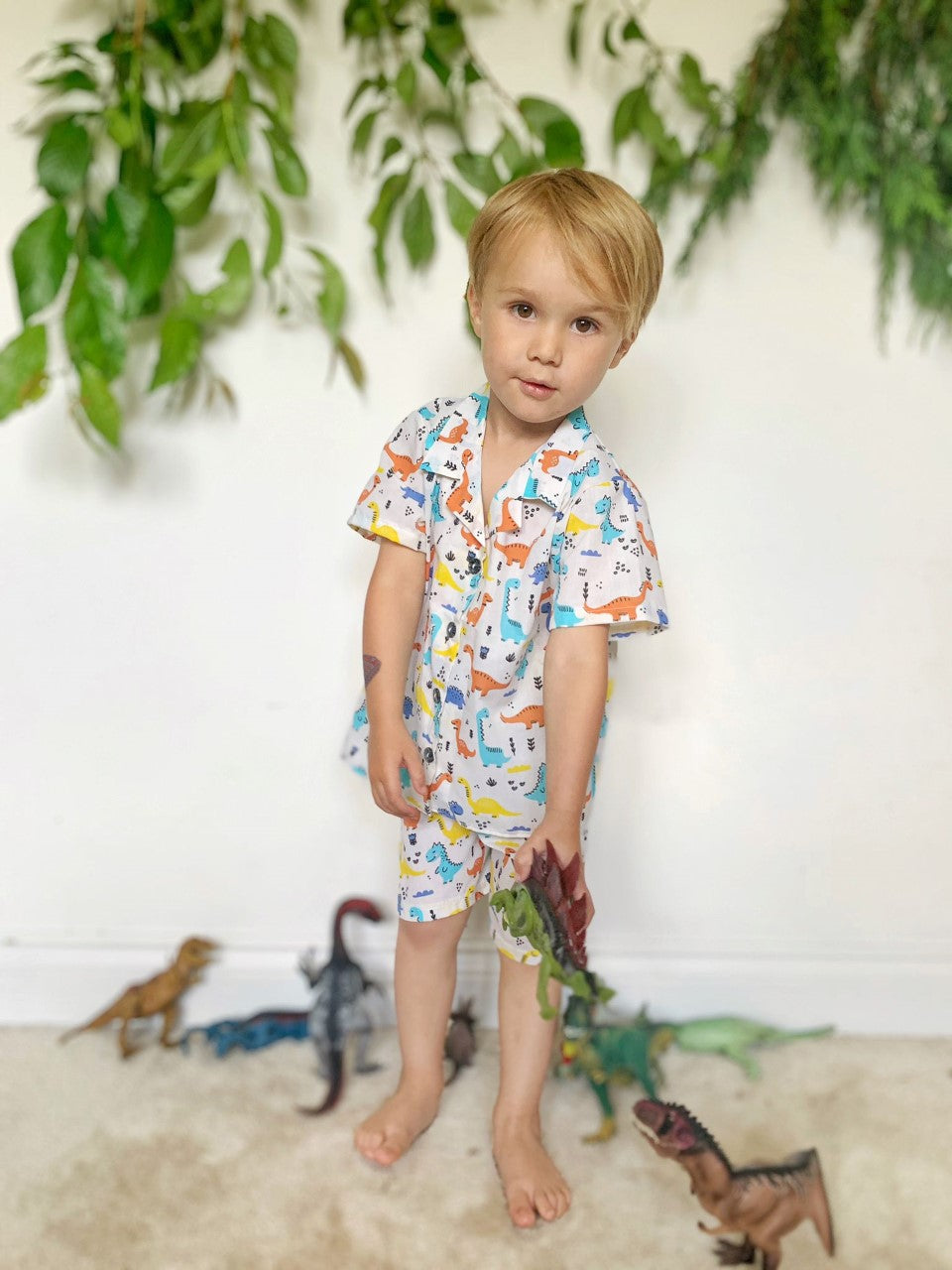 Slip into wonder with this enchanting dinosaur pyjama set. Designed in soft, breathable cotton, it showcases a striking fierce dinosaur print that captures imagination. The short-sleeved top features charming funky buttons and pairs perfectly with coordinating shorts. Lightweight and gentle against the skin, this magical set makes bedtime feel like an adventure, ideal for anyone who loves these prehistoric creatures.