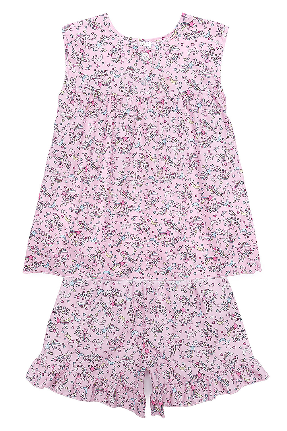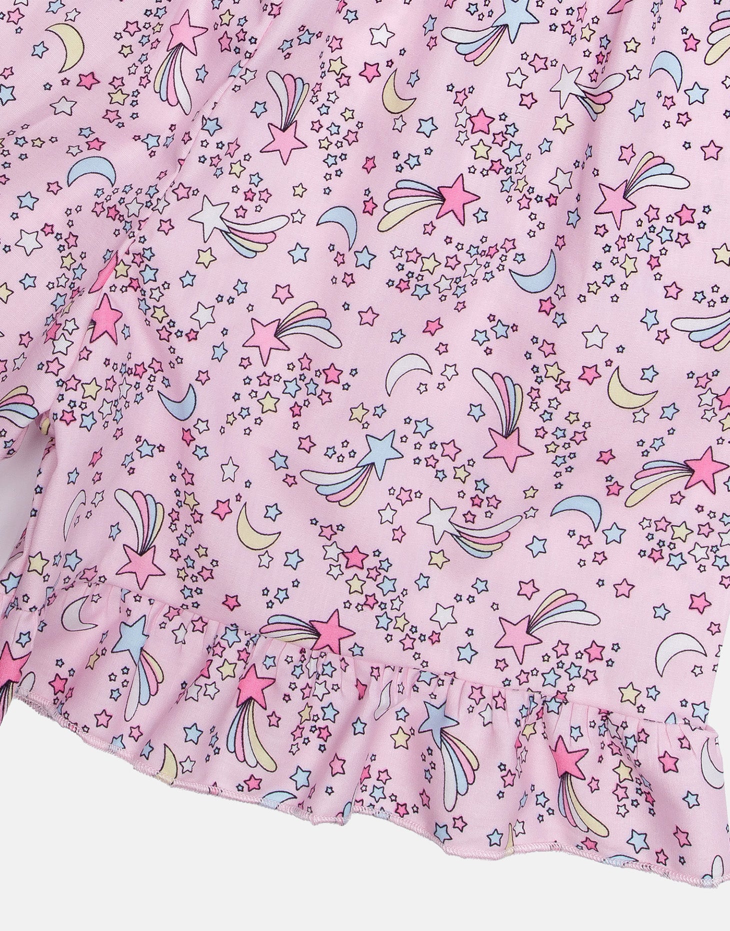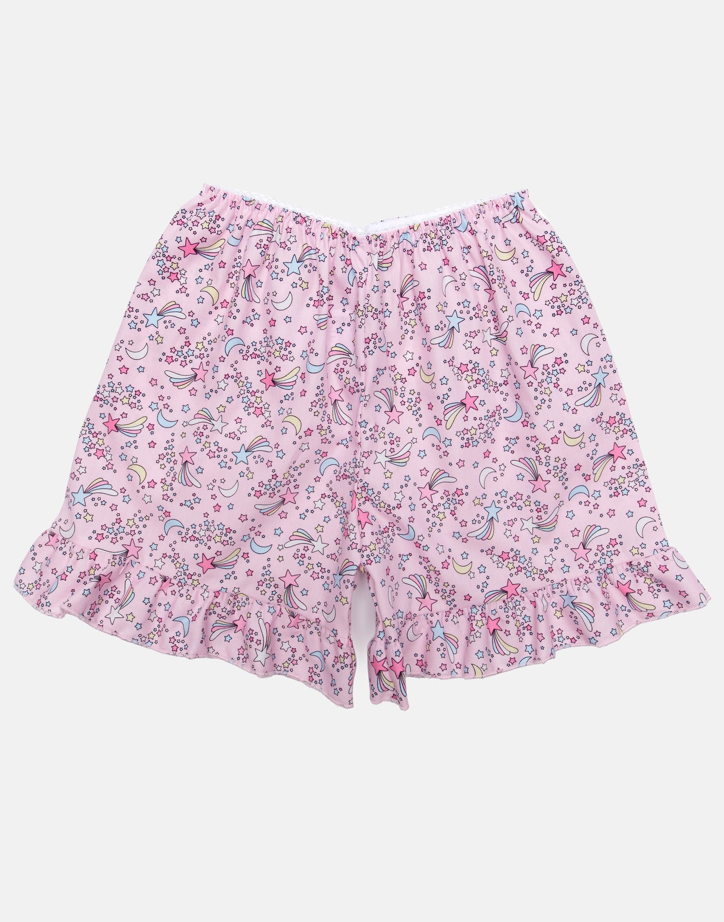 Embrace the wonder of the night sky in this cosmic pyjama set. Fashioned from 100% cotton, it provides the softness and breathability needed for comfortable sleep. Adorned with a celestial moon and star motif, complete with glimmering buttons and ruffled shorts, this set adds a subtle touch of magic to bedtime routines. Suitable for any season, it transitions effortlessly from quiet nights in to sleepovers with friends. A lovely choice that brings a hint of starlight to your little ones sleepwear collection.