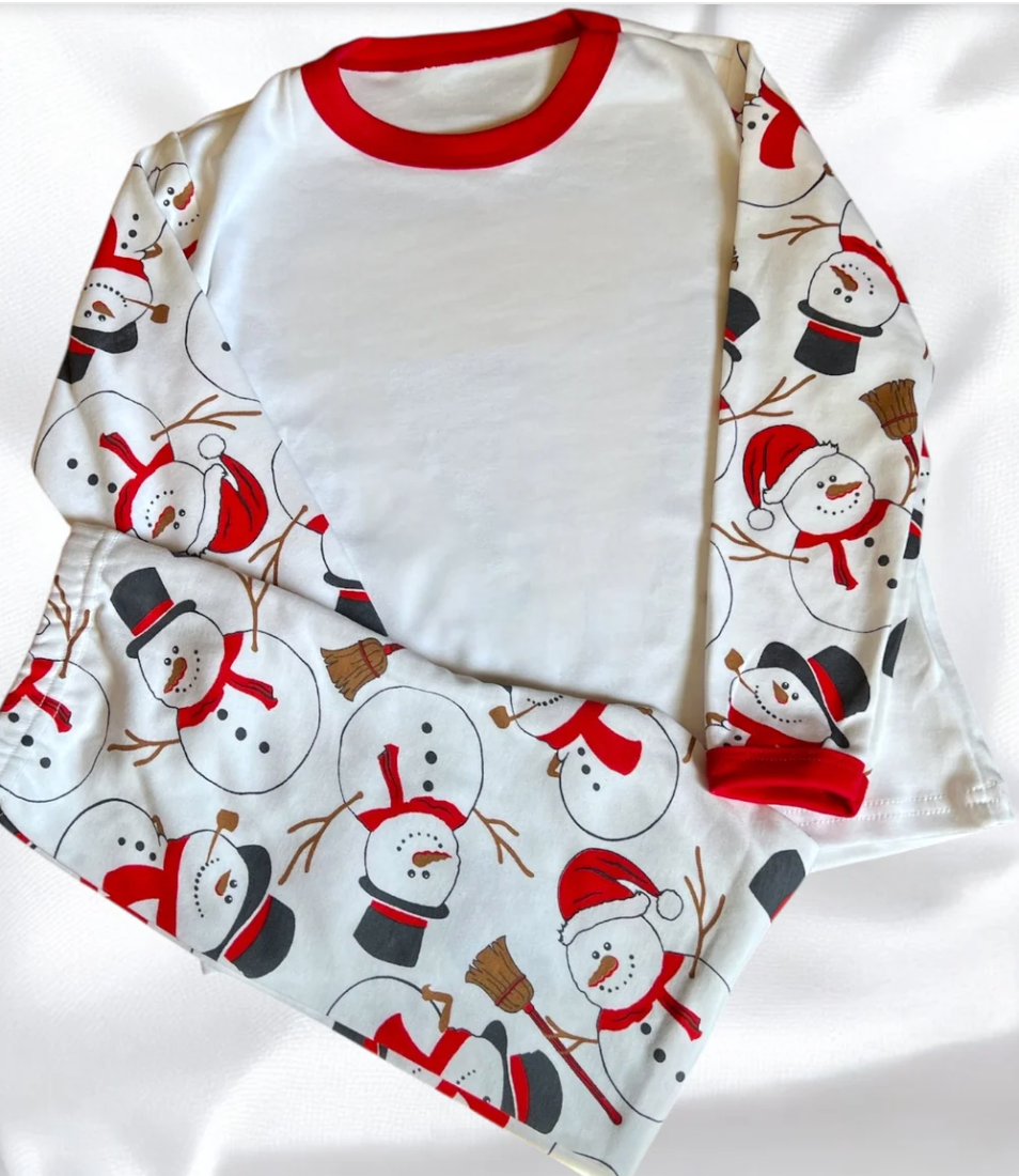 Experience the enchantment of these cotton pyjamas, accentuated by a charming snowman print on the sleeves and trousers. The top boasts a festive red collar while the bottoms feature cosy cuffs for added cosiness.