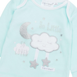 These enchanting pyjamas are made from soft cotton and feature the phrase 'So Little So Loved' on the top. The adorable bottoms are decorated with stars, clouds, and moons. The cuffs, collar, and elastic waistband add to the overall comfort of this perfect set.