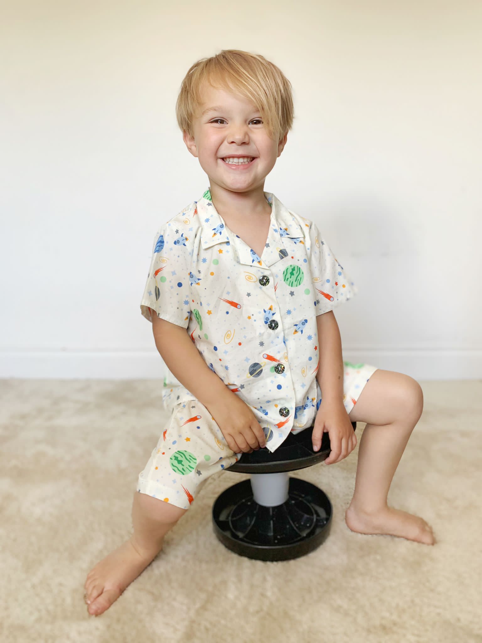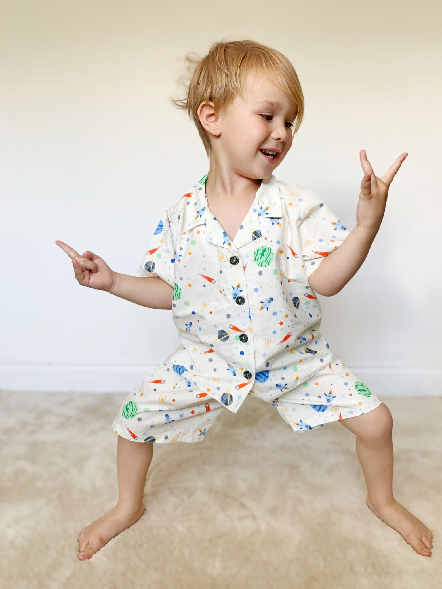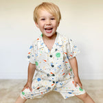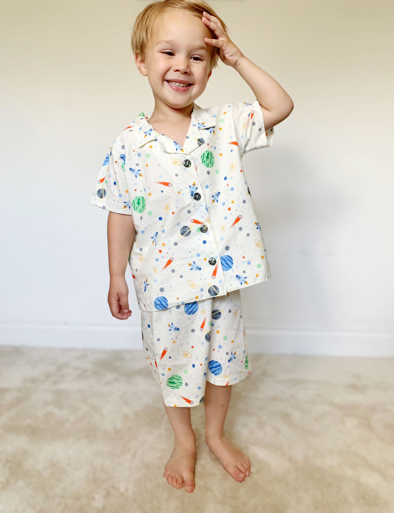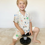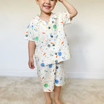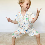 Discover the magic of the cosmos with this delightful space-themed pyjama set. Made from breathable 100% cotton, this two-piece features a short-sleeved buttoned top and matching shorts, both displaying a captivating space print with whimsical cosmic buttons. The soft, lightweight fabric ensures comfort through the night while celebrating a love of the stars. Perfect for young space enthusiasts seeking comfort and a touch of celestial charm.
